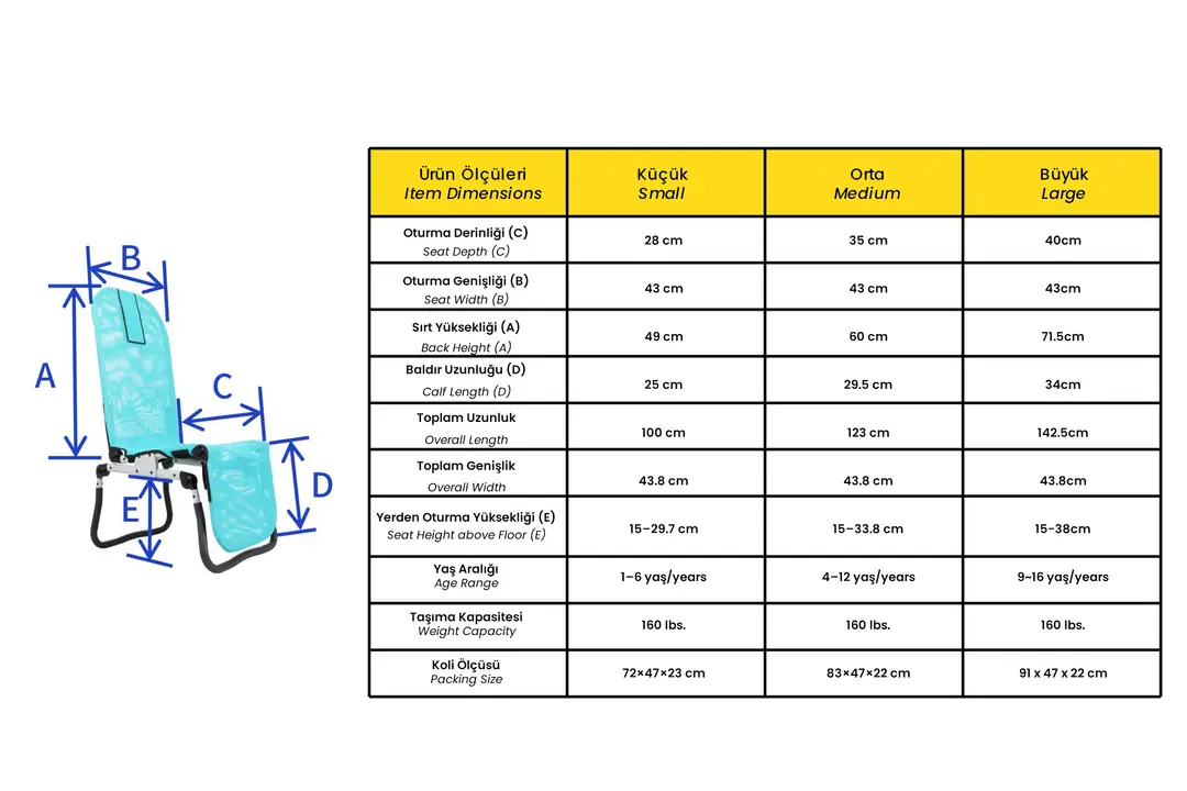 Çocuk Banyo Tekerlekli Sandalyesi, oturma ve denge sağlama zorluğu yaşayan çocuklar için özel olarak tasarlanmış bir üründür. 1-16 yaş aralığındaki çocuklar için uygun olan bu banyo koltuğu, ebeveynler ve bakıcılar için büyük bir kolaylık sunar. 72 kg’a kadar taşıma kapasitesine sahip olan G559, farklı yaş ve beden ölçülerine uygun olarak küçük, orta ve büyük boy seçenekleriyle sunulmaktadır. Mavi, pembe ve turuncu renk alternatifleri, çocukların ilgisini çekmektedir.